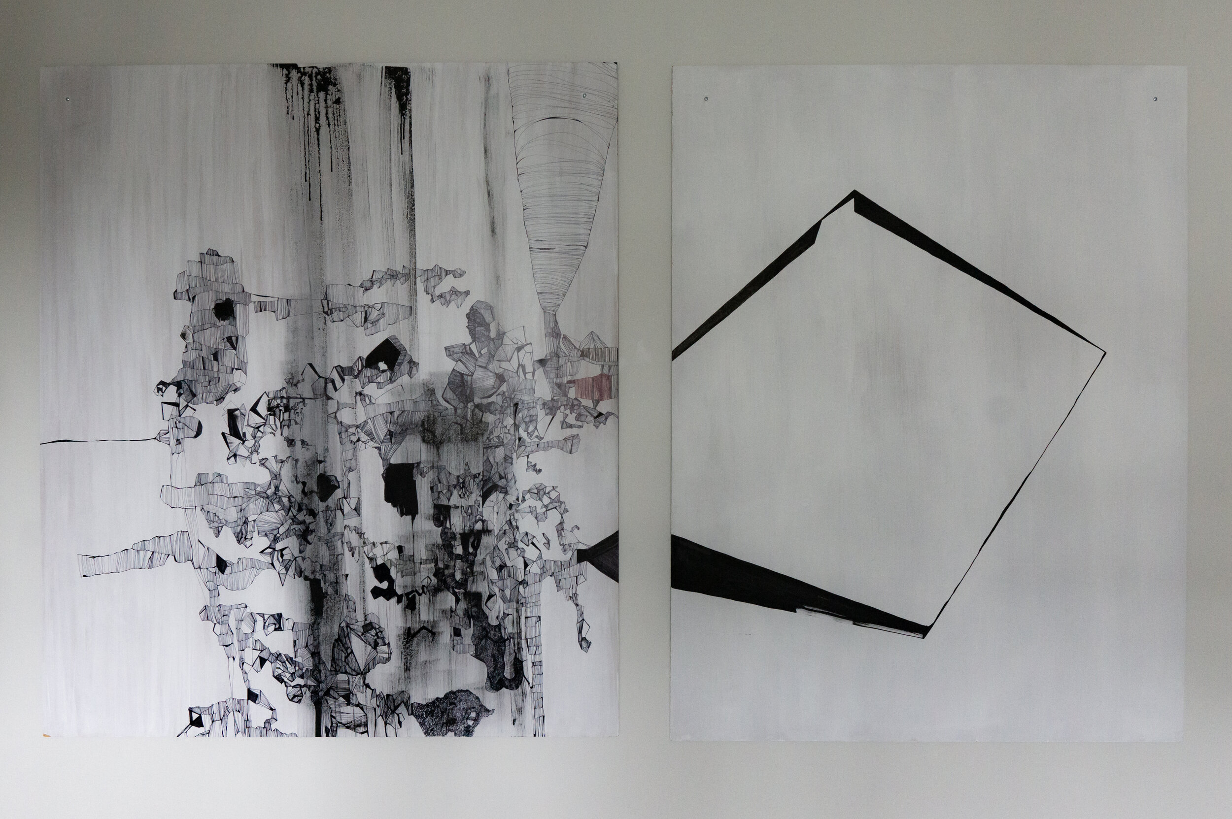 “Tysta orkaner” & “Det slutar aldrig” - Inc, acrylic on mdf board, 120x120 cm & 108x120 cm - SOLD