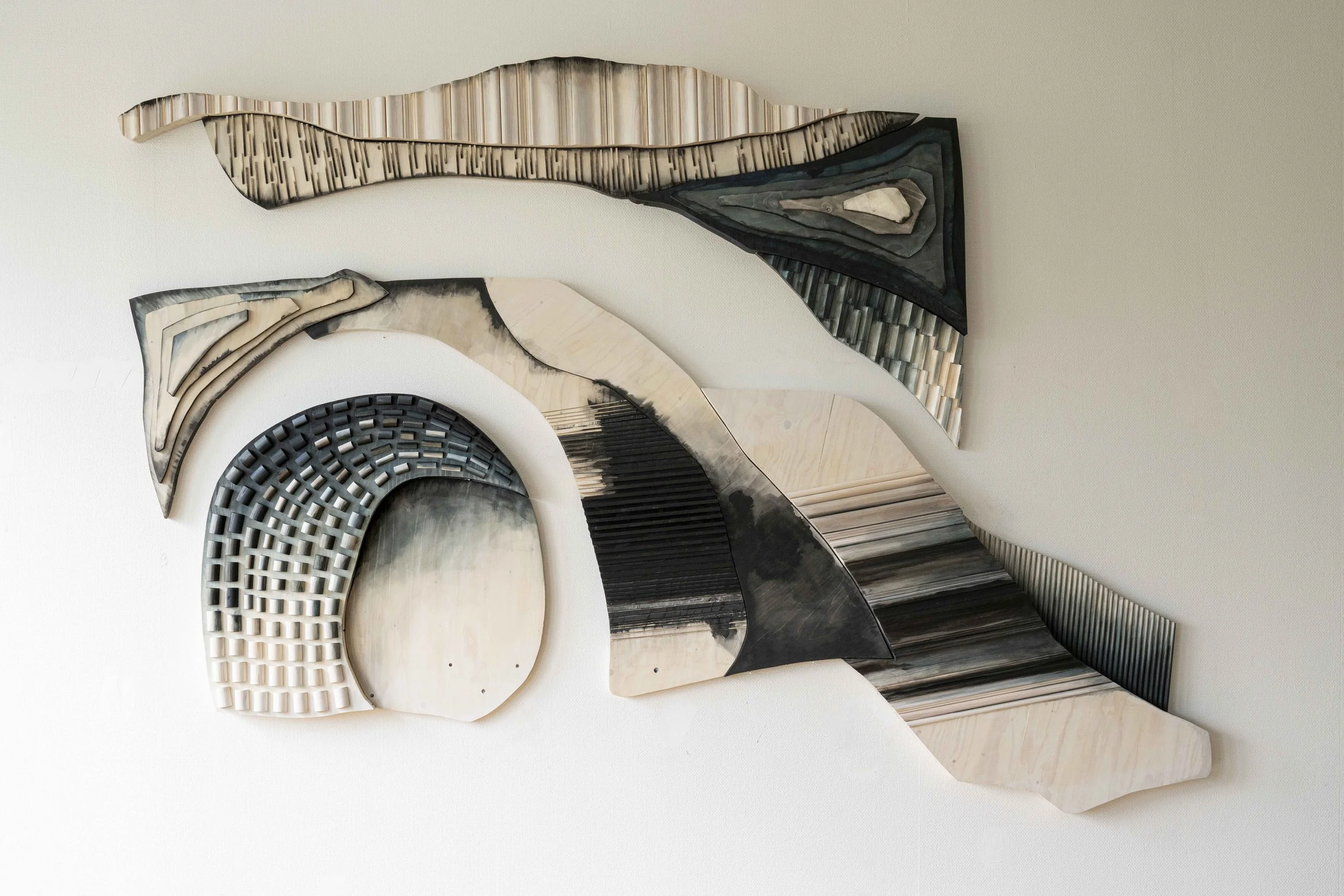 A composition of five separate parts mounted on the wall. Stained and varnished pine. Size 200 x 150 cm. Made in wood panels with different profiles. Inspired by landscapes and soil structures as well as by the different "hatch" used in architectural drawing programs.
